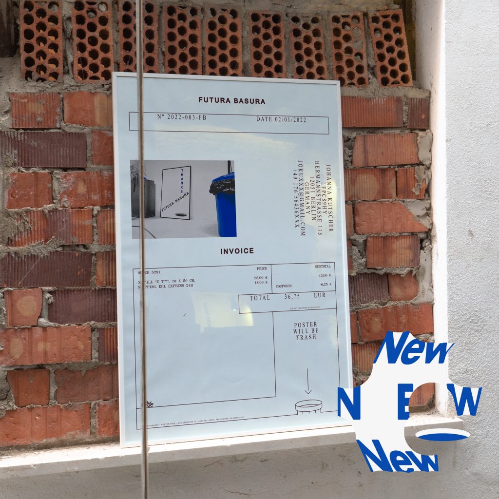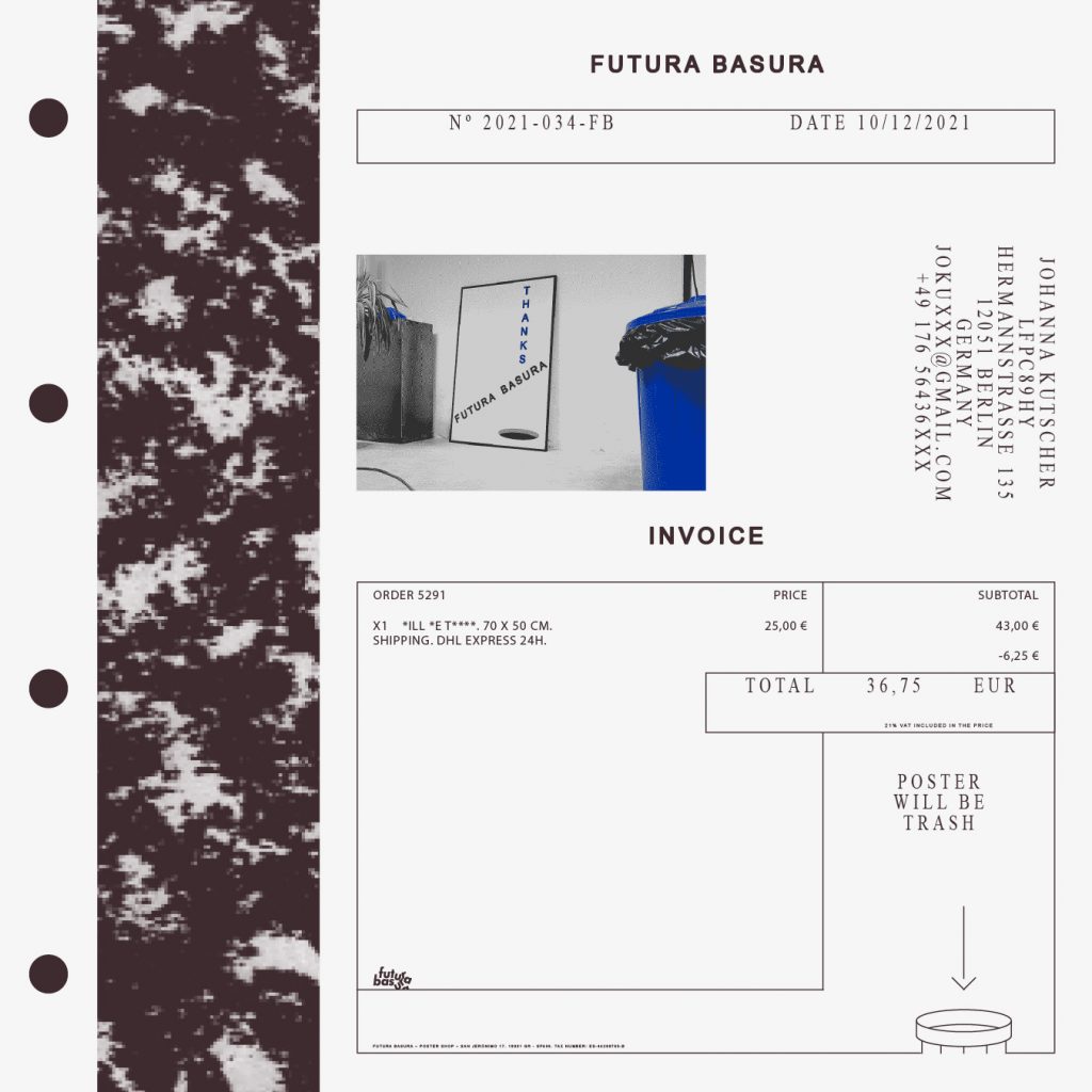 The works exhibited or marketed on our website are protected by copyright which are managed by Futura Basura with its collaborating artists. For the reproduction, distribution and/or transformation of these pieces, it is necessary to obtain the authorisation of the author of the work or the manager of their rights. Futura Basura is not responsible for the use or manipulation by third parties of these works and images, nor for possible claims by third parties against the artists who participate here.